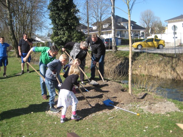 Anschließend ging es weiter zum Gröbenbach. Viel los war hier bei der Pflanzung einer Sandbirke für die Geschwister Lilly Frieda und Romy. Hier halfen außer mehreren Kindern auch die Gemeinderätin Cordula Braun sowie der Bürgermeister Martin Schäfer beim Eingraben.