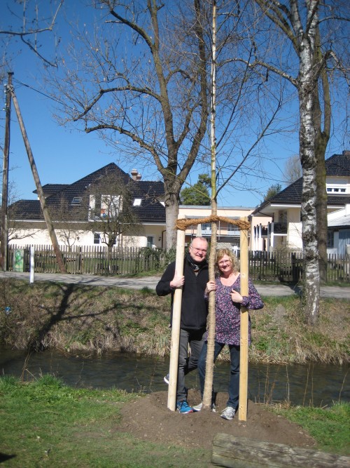 Stolz umfasst das Ehepaar Marschall ihre neu gepflanzte Sandbirke.