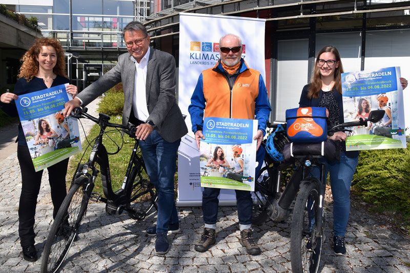 Foto (v.r.): Aneta Höffler (Klimaschutzmanagement des Landratsamtes) Thomas Karmasin (Landrat), Adi Stumper (Vorstandsmitglied des ADFC Fürstenfeldbruck), Nicole Kührer (Klimaschutzma-nagement des Landratsamtes). Foto: LRA FFB