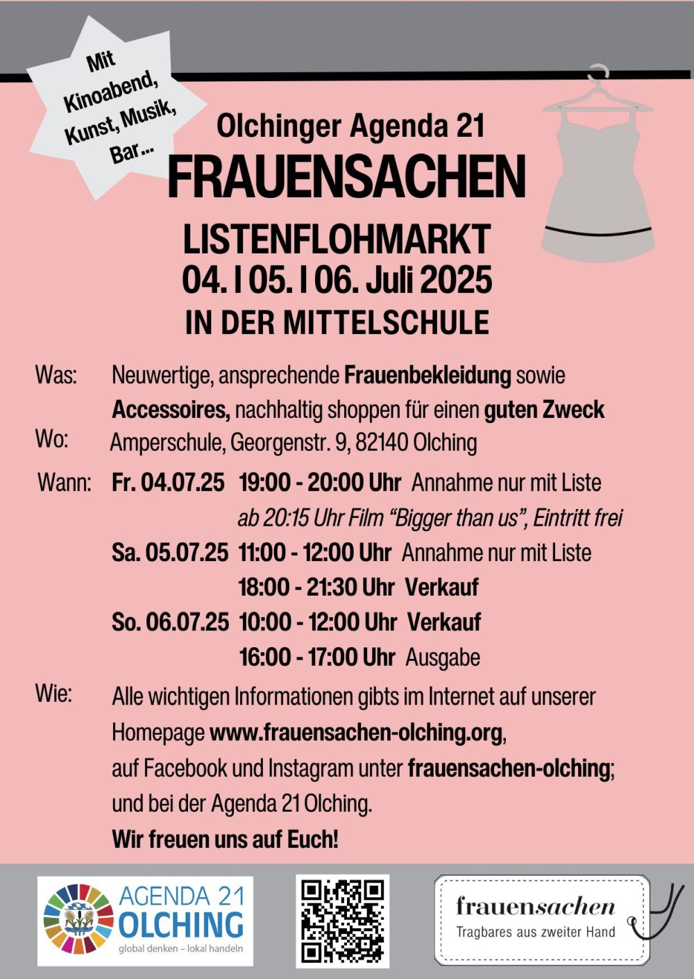 Am ersten Juli Wochenende findet in Olching wieder das beliebte FRAUENSACHEN Wochenende statt. Der Verkauf des Listenflohmarkts startet am Samstag 5. Juli 2025 ab 18.00 Uhr und am Sonntag 6. Juli 2025 ab 10.00 Uhr.