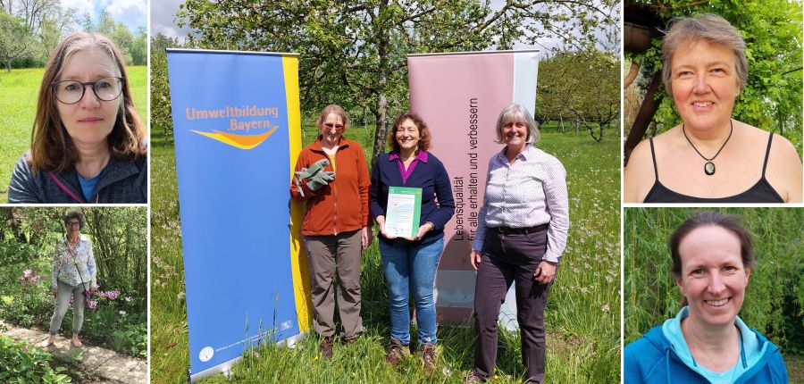 Die Umweltbildner in der Übersicht: Angelika Richter (links oben), Jasmin Semrau (links unten), Susanne Mannchen (rechts oben), Julia Traxel (rechts unten), Brigitte Thema (freie Mitarbeiterin, mittleres Bild links), Christine Weiß (freie Mitarbeiterin, mittleres Bild Mitte) und Michaele Bock (AGENDA-21-Büro Landratsamt, mittleres Bild rechts)