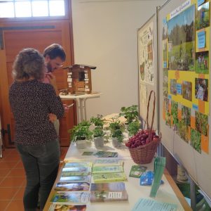 Dahinter treffe ich auf den Stand des AK Natur und Landschaft mit seinem Kernprojekt „Rund um die Estinger Streuobstwiese“. Bei einem Wiesenkräuter-Quiz kann ich mein Wissen testen. Kann ich die Bildkarte dem entsprechenden Kräutertopf zuordnen? Bin ich mir unsicher, steht mir Kräuterpädagogin, Christine Weiß, helfend zur Seite. Somit lernte ich spielend etwas über die Essbarkeit von Wiesenkräutern, auf denen ich bisher achtlos umhergetrampelt bin. An Beispielen von Insektenhotels, angefangen von einem Stern bis zum Vier-Sterne-Musterhotel , erfahre ich, worauf es zu achten gilt, wenn ich den Insekten wie Wildbienen, Florfliegen, Marienkäfern, Schmetterlingen usw. in meinem Garten oder auf meinem Balkon eine Nisthilfe anbieten möchte. An den Ständen des AK Wirtschaft und Arbeit in nachbarschaftlicher Nähe mit dem Behinderten Beirat schlenderte ich vorbei; deren Aktionen finden in praktischer Form andern Ortes statt.