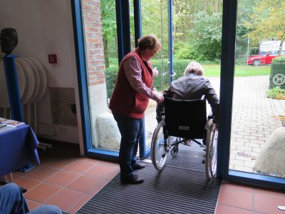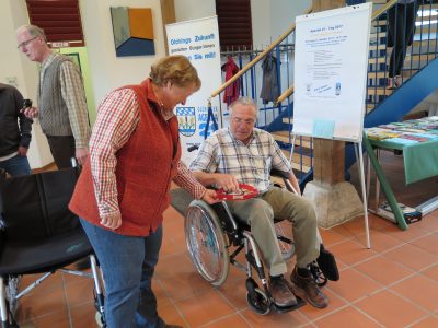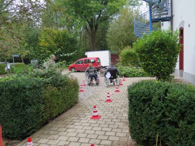 Ich hingegen gehe dafür das Thema Rollstuhlfahren praktisch an, setze mich in einen der bereit gestellten Rollstühle und lasse mir ein paar wichtige Tipps geben, bevor ich den vom Beirat für Menschen mit Behinderung aufgebauten Rollstuhl-Parcours mal eben befahre. Aber mit „mal eben“ ist es nicht getan! Auch wenn ich ein paar wichtige Regeln zum Thema Fahren mit dem Rollstuhl erklärt bekam, brauche ich eine gewisse Gewöhnungsphase für das Geradeaus-, Kurven- und Rückwärtsfahren. Die erste Hürde beginnt mit dem Öffnen der Tür. Eine Hand drückt den Türgriff, drückt die Tür auf, während die andere Hand das Rad nach vorne schiebt, beides gleichzeitig will mir nicht gelingen, die Tür ist zu schwer. Ich brauche Hilfe. Dann die Schwelle, die Steigung, runter geht’s, bremsen, die Kurven, Fahren auf Kies, Strecke fahren und wieder eine Tür. Zwei Türen! Geschafft. Zur Belohnung gibt es Süßes. Ich aber befürchte Muskelkater, den ich am nächsten Tag in Armen und Nackenmuskeln spüren werde. Und ich fühle Erleichterung, dem Rollstuhl entkommen zu können. Dann eine weitere Runde – nur jetzt mit dem Rollator. Was naiver Weise keinesfalls leichter zu bewerkstelligen ist!
