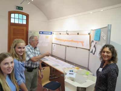 Am Stand des AK Verkehr werde ich freudig vom Sprecher Axel Pesall begrüßt. Seit Jahren setzt sich sein AK mit einem konkreten Vorschlag für eine Veränderung der Hauptstraße in Olching ein. Vorbild ist das bereits in anderen Städten praktizierte „Shared Space“, bei dem alle Verkehrsteilnehmer, also Radfahrer, Fußgänger sowie Autos, gleichberechtigt den Verkehrsraum nutzen. Der AK Verkehr bleibt beharrlich am Ball, dem Bürgerwunsch aus der Zukunftskonferenz 2010/2011 Rechnung zu tragen, der da heißt: „Unsere Hauptstraße lädt mit ihren attraktiven Geschäften, dem gastronomischen Angebot und den heimeligen Plätzen zum Flanieren und Verweilen ein. Alle Verkehrsteilnehmer, gleich ob zu Fuß, mit dem Rad oder Auto, ob alt oder jung, kommen sicher an ihr Ziel. Entspannt bummeln, Pause machen und in einheimischen Geschäften einkaufen, so soll es werde.“ Besser als an diesem Standort konnte das Schülerprojekt zum Thema Raumplanung aus dem letzten Schuljahr nicht platziert werden. Ich kannte das Projekt bereits von der diesjährigen Science Fair des Gymnasium Olching, bei der Kathrin Schmid und Victoria Spöttl für ihr Projekt „Wahrnehmungsgeographie in öffentlichen Räumen“ auf der Science Fair 2017 den Nachhaltigkeitspreis 2017 der Agenda 21 erhielten.