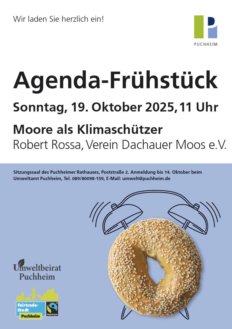 Der Umweltbeirat und das Umweltamt der Stadt Puchheim lädt herzlich zum diesjährigen Agenda-Frühstück am Sonntag, dem 19. Oktober 2025 um 11 Uhr in den Sitzungssaal des Rathauses ein. Sie werden mit einem nachhaltigem Frühstück mit saisonalen, regionalen, ökologischen und fair gehandelten Produkten verwöhnt und haben gleichzeitig die Möglichkeit, sich über Moore und ihre Bedeutung zu informieren.
