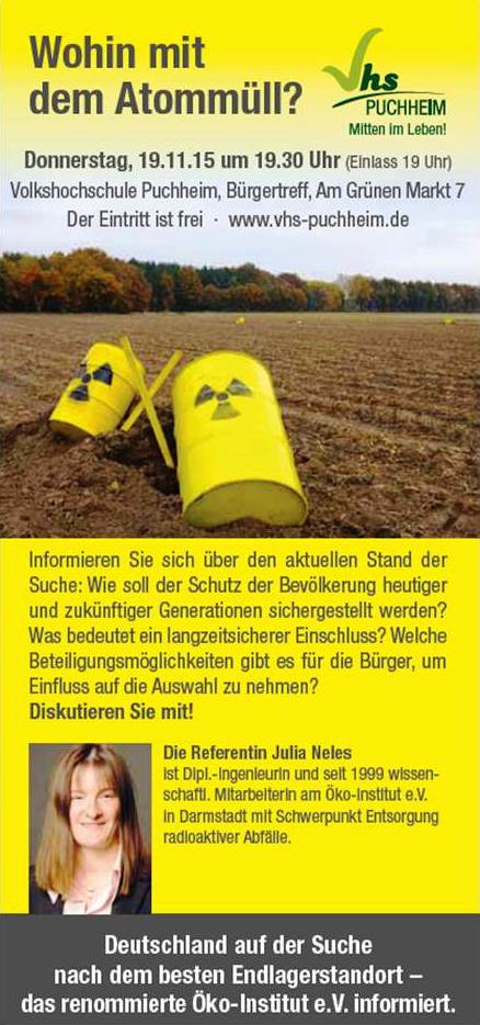 Am 19. November 2015 um 19:30 Uhr geht es bei diesem Vortrag um das sorgenvolle Thema: Wohin mit dem Atommüll? Referentin Julia Neles, Diplom-Ingeneurin und wissenschaftliche Mitarbeiterin am Öko-Institut in Darmstadt hält im Bürgertreff einen Vortrag über die Entsorgung radioaktiver Abfälle.