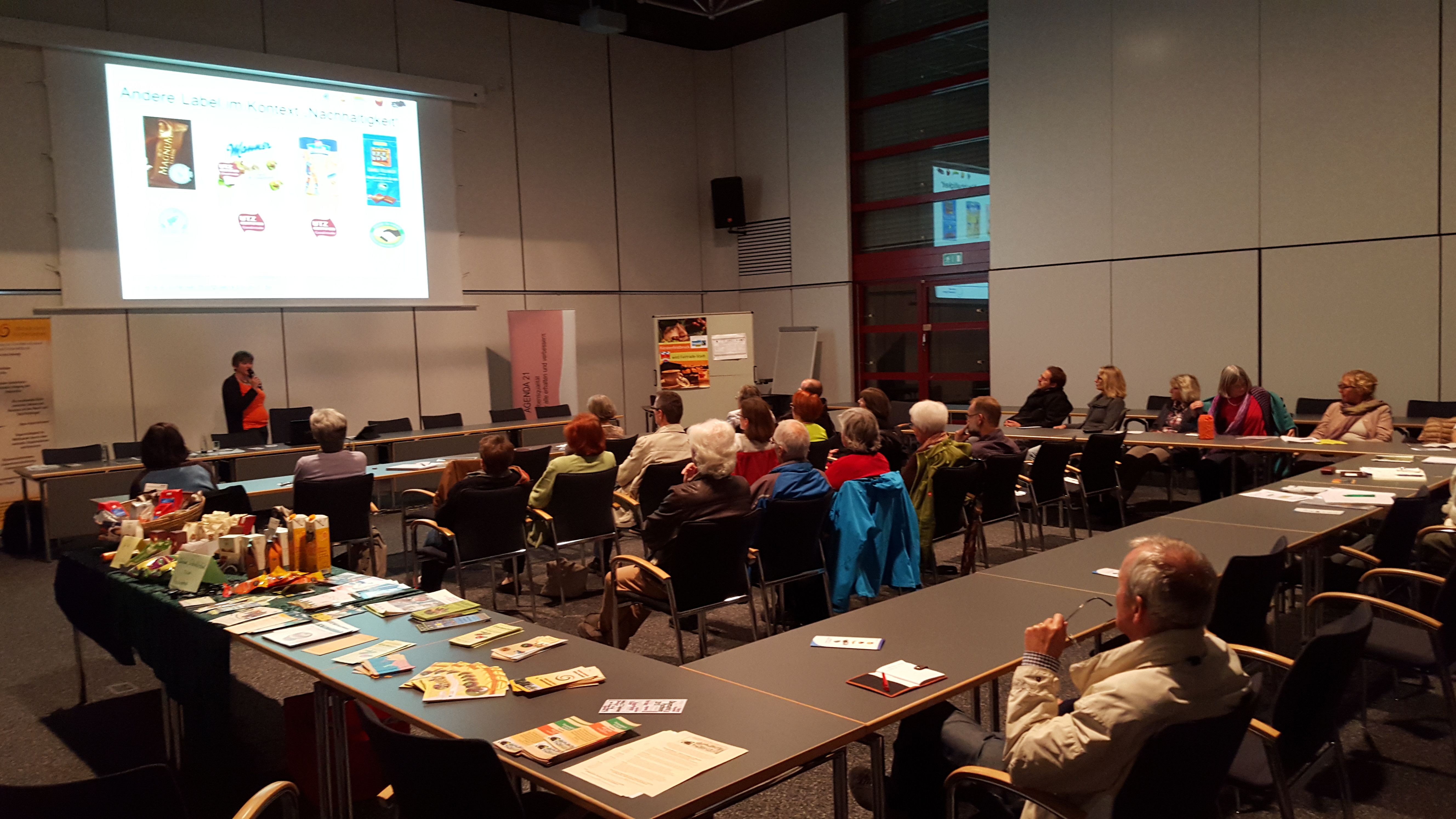 Referentin Annegret Lueg, Fair-Handels Beraterin im Eine Welt Netzwerk Bayern e.V., versuchte Licht ins Dunkel der vielzähligen Labels, Logos, Signets und Siegel von fair gehandelten Produkten zu bringen. Grundsätzlich verwies Lueg auf die vier großen Fairhandels-Siegel, die Produkteigenschaften wie fair gehandelt, biologische, naturnahe und gentechnikfreie Erzeugung garantieren: FAIRTRADE, Naturland Fair, fair for life und das französischen Label Ecocert. Diese Fair-Trade-Siegel werden von Organisationen vergeben, die im internationalen Dachverband Fairtrade Labelling Organization International (FLO) zusammengeschlossen sind. Die Vergabe von Fair-Trade-Logos ist an eine Reihe von Kriterien geknüpft, die von der FLO mit Sitz in Bonn entwickelt und festgelegt werden. Dazu zählen der direkte Handel mit den Produzentengruppen ohne Zwischenhändler, Vorfinanzierung und langfristige Lieferbeziehungen sowie ökologische Standards.