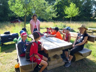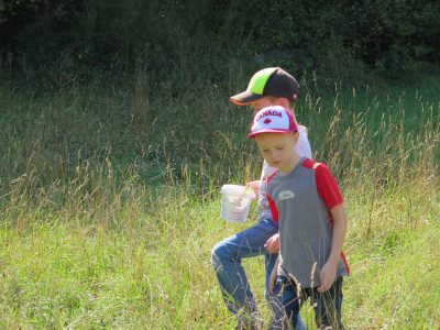 Unseren Durst löschten wir mit der von Christine vorbereiteten, eiskalten Kräutersaftschorle. So gestärkt, liefen wir alle noch einmal mit Lupe und Becherlupe bewaffnet in die Wiese, dieses Mal auf der Suche nach Grashüpfern, kleine Spinnen, Bienen und den vielen, vielen Wespen und was sonst noch auf der ungemähten Wiese kreucht und fleucht.