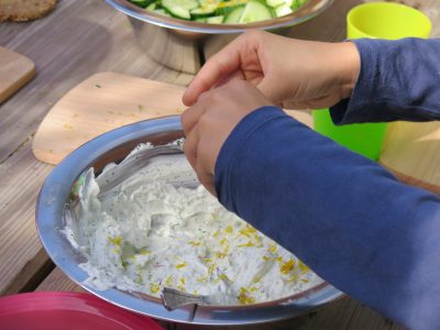 Gezielt suchten sie nach verwertbaren Wiesenkräutern, die dann später sorgsam gewaschen, kleingeschnitten und mit frischem Quark vermengt, zu einem einzigartigen Brotaufstrich verwertet wurden. Mit der eifrig und beharrlich selbst geschüttelten Butter, ebenfalls angereichert mit derselben Wiesenkräutermischung, kam ein zweiter, leckerer Brotaufstrich hinzu. Und nach all dem Suchen, Finden, Lernen, Schütteln, Schneiden ganz hungrig geworden, genossen wir alle ganz besonders unsere selbstgemachte, duftend frische Brotzeit.