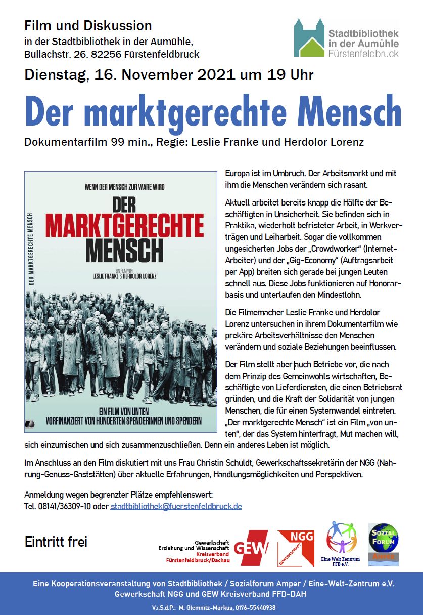 Am Dienstag, den 16. November 2021 zeigt ein Bündnis verschiedener Organisationen den Film „Der marktgerechte Mensch“ in der Stadtbibliothek Fürstenfeldbruck.