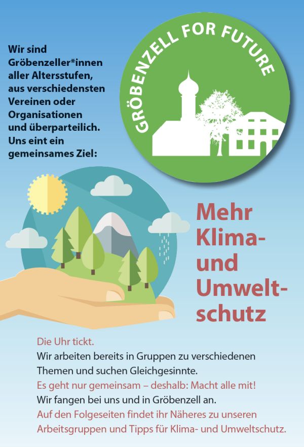 Die Gruppe „Gröbenzell for Future“ (kurz: GFF) möchte Gleichgesinnte für mehr Klima- und Umweltschutz gewinnen. In verschiedenen Arbeitsgruppen haben sich Interessierte aller Altersstufen aus verschiedensten Vereinen und Organisationen zusammengeschlossen.