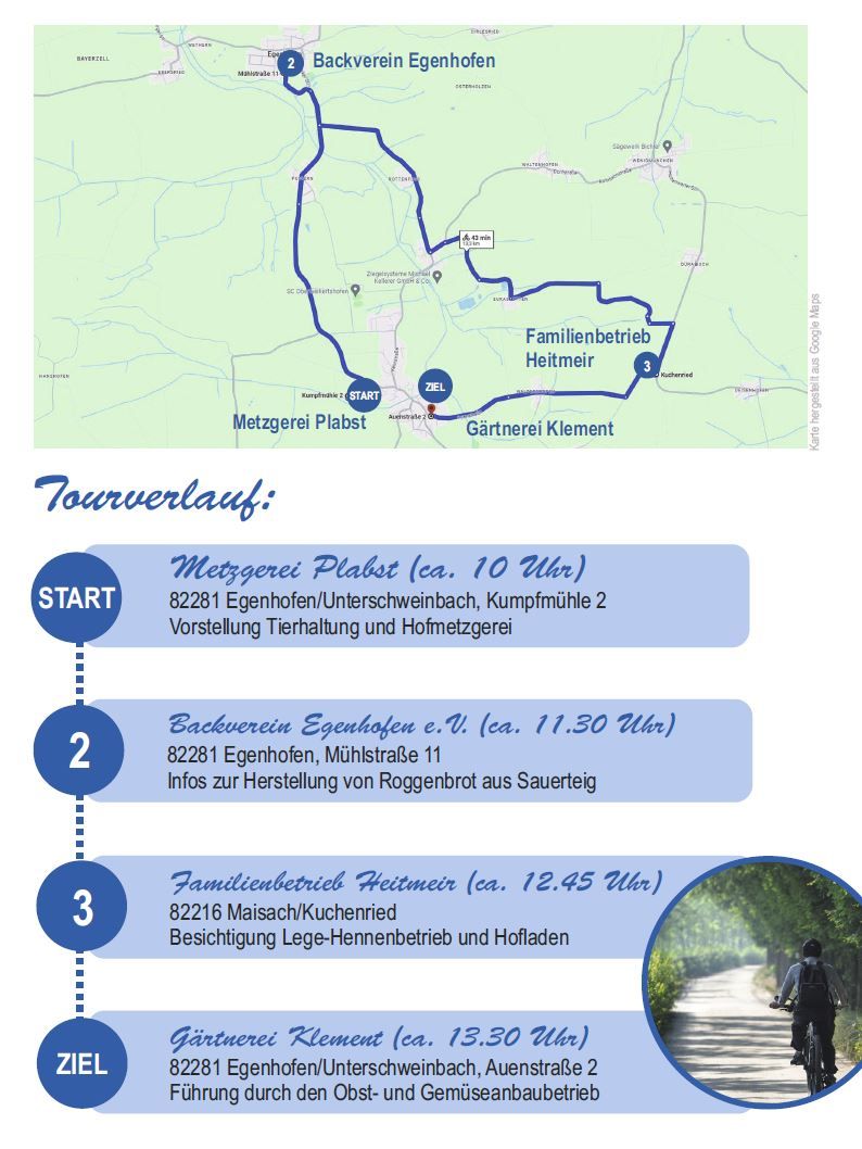Am 22. September 2024 darf das Auto zu Hause bleiben, denn der Tag steht unter dem Motto „Autofreier Sonntag“. Aus diesem Anlass lädt die Agenda 21 zusammen mit dem Ernährungsrat und dem Klimaschutzmanagement abermals zur beliebten Hofladenradtour ein. Start ist die Hofmetzgerei Plabst in Unterschweinbach. der Hofladen der Familie Britzelmair in Puch. Der Streckenverlauf von zirka 13 Kilometern ist von der Schwierigkeit her moderat und für alle Radlerinnen und Radler gut zu bewältigen. Die Rour endet wieder in Unterschweinbach bei der Gärtnerei Klement.