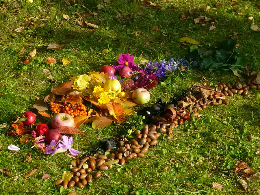 Bunte Namensschildchen und eine prächtige Sammlung von den vielen Dingen, die sich in der herbstlichen Natur finden lassen, haben den „Tisch reich gedeckt“: