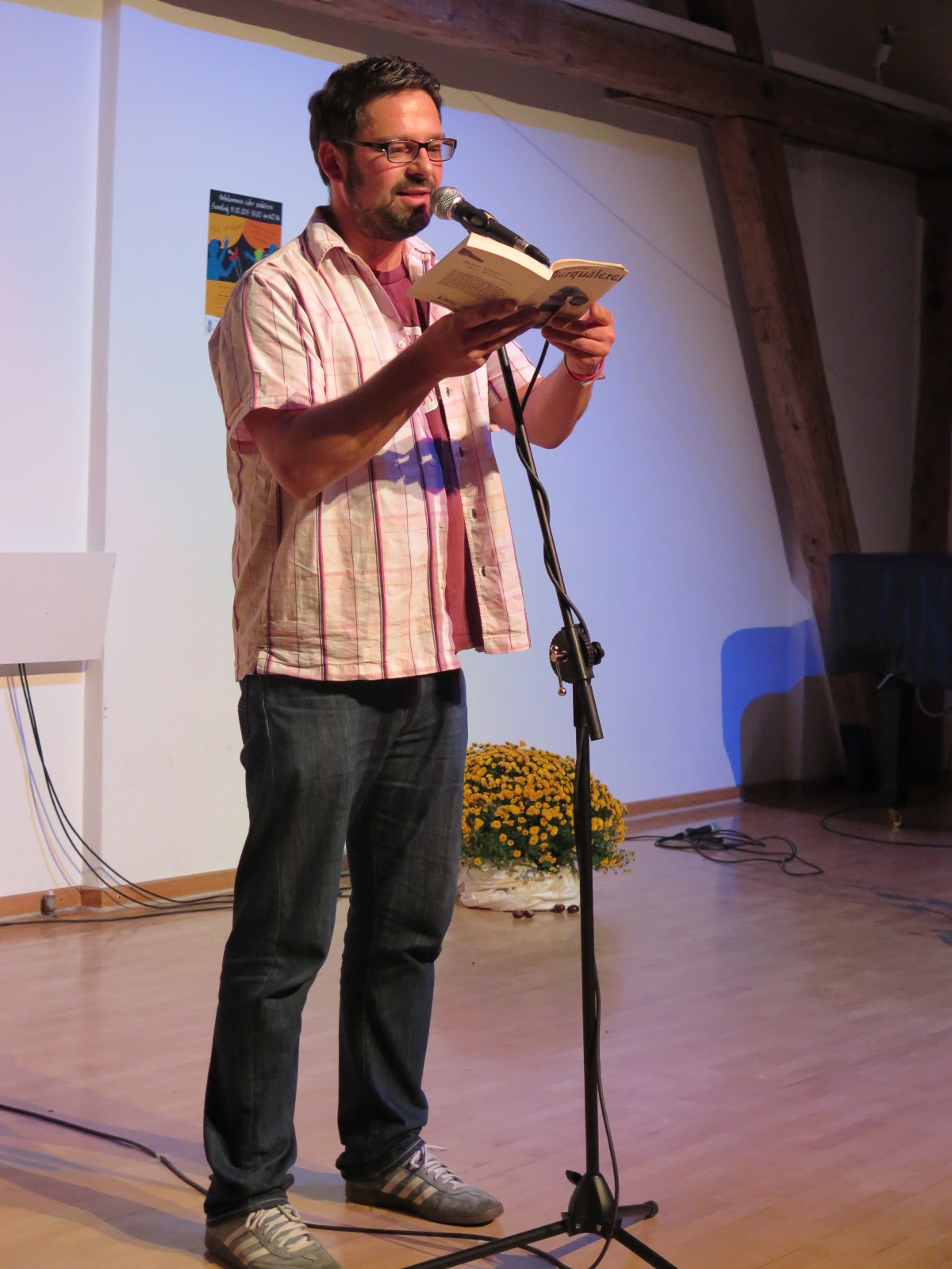 Mit seiner herzerfrischenden Art führte Jan souverän durch den Abend. Da er den Poetry Slam mit nur fünf Poeten gestalten sollte, lockerte der Master kurzerhand die Regeln und jeder Poet trug zwei Texte vor, von denen dann das Publikum am Ende der Veranstaltung den Sieger erklatschte. Zunächst aber lasen zu Beginn Urte Langer und Jan Haas außen Konkurrenz