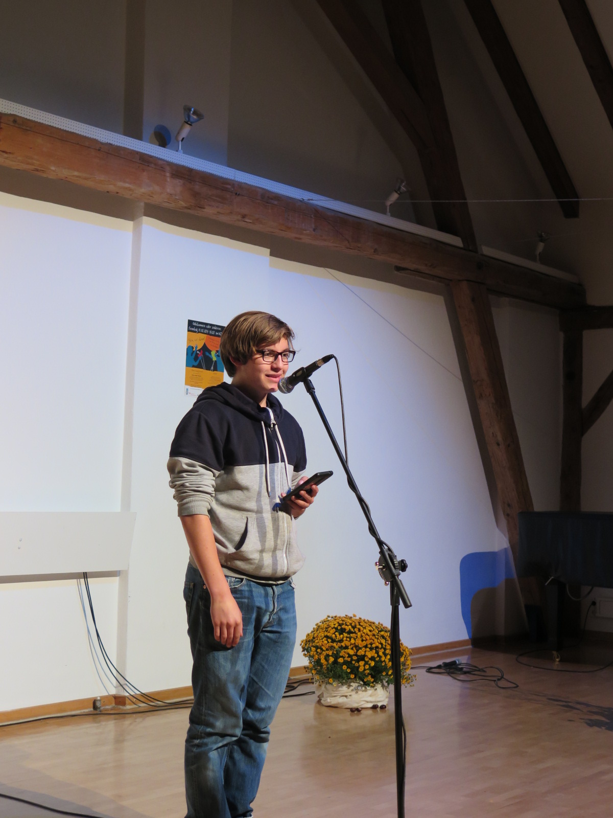 Und dann der Jüngste im Bunde, Tim Niklas, dem daheim noch alles schief lief, dem sein Drucker den Dienst verweigerte, so dass er seine Texte nicht auf Papier mitnehmen konnte, sondern diese vom Smart Phon ablesen musste, der, weil er mit dem Radl kam, sich in Olching verirrte, dann aber doch noch rechtzeitig zum Anpfiff erschien, dieser Tim Niklas, 16 jähriger Schüler aus Fürstenfeldbruck, überzeugte am Ende das Publikum mit seinem Text über einen perfide quälenden Schüler, der den Lebensweg seiner Mobbingopfer nachhaltig beeinflusst. Seine Darbietung ließ das Publikum zunächst ergriffen verstummen, dann frenetisch applaudieren und am Ende zum Sieger des Abends küren! Zum Schluss gab es als Dankeschön für jeden Teilnehmer eine Schokolade aus dem neuen Eine Welt Laden in Fürstenfeldbruck. Dem Sieger wurde zusätzlich eine Geschenkschachtel mit Leckereien aus fair gehandelten Produkten überreicht.