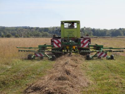 Worauf es ankommt: Das gesamte Ampermoos hat eine Größe von fast 600 ha. Es ist Naturschutzgebiet, Ramasgebiet und Natura 2000. Das heißt: eine Pflege zum Schutz und Erhalt der Moorflächen und Streuwiesen bedarf einer bedachte und schonenden Bearbeitung. Hierbei müssen Pflege- und Naturschutzverbände sowie Landwirte und die angrenzenden Kommunen im Konsens zusammen arbeiten. Es gilt Brutzeiten einzuhalten und Maschinen einzusetzen, die die Bodenstruktur bestmöglich schont, denn mooriger Boden ist ein federnder, meist  feuchter und besonders sensibler Untergrund. Bei der Wiesenmahd geht es im ersten Schritt um den Wiesenschnitt, Schritt zwei dem Schwaden (in zu Reihen aufgehäufeltes Heu), dann dem Aufsammeln der Schwad und zuletzt dem Einsammeln der gepressten Heuballen.