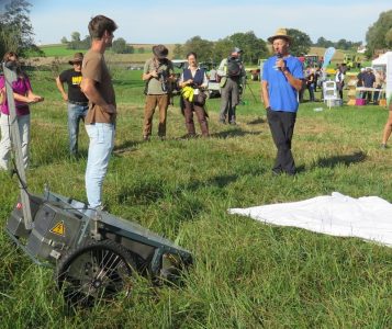 Zum praktischen Teil: Als Erstes wurde dem Publikum der eBeetle vorgestellt, eine Maschine zur schonenden Saatgutgewinnung. Seine Aufgabe ist es, von regionalen, schützenswerten Wiesenflächen das Saatgut zu entnehmen, das dann auf vorbereiteten „Nachbarflächen“ mit genau dieser autochthonen Saat wieder geimpft werden kann.
