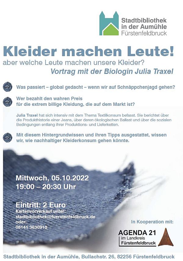 Im Rahmen der Deutschen Aktionstage Nachhaltigkeit und der Europäischen Nachhaltigkeitswoche mit dem Schwerpunkt Textil finden in der Stadtbibliothek in der Aumühle diverse Vorträge und Aktionen statt. Die Auftaktveranstaltung ist am 5. Oktober 2022 der Vortrag der Biologin Julia Traxel zum Thema: „Kleider machen Leute – aber welche Leute machen unsere Kleider und unter welchen Umständen? “